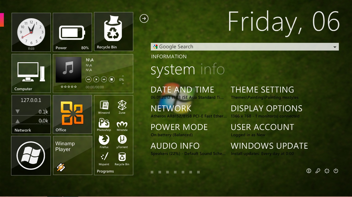 Tampilan windows seven memang cukup memanjakan mata dan peformanya yang cukup handal yang bisa dikatakan windows 7 ini sudh perfect namun setelah perkembangan windows dengan hadirnya windows 8 maupun windows developer Preview windows seven ini agak kalah saingan dalam masalah tampilan misalnya windows developer preview ini menghadirkan antar muka yang berbentuk kotak kotak pada tampilan icon start menunya yang sangat cocok sekali untuk penggunaan komputer yang mempunyai lcd layar sentuh/torch screen, berikut screenshot tampilan windows develope priview